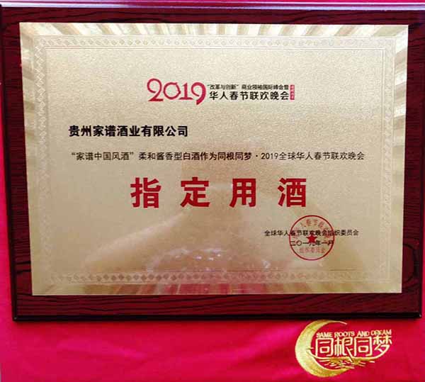 貴州家譜酒榮獲2019全球華人春節(jié)聯(lián)歡晚會指定用酒